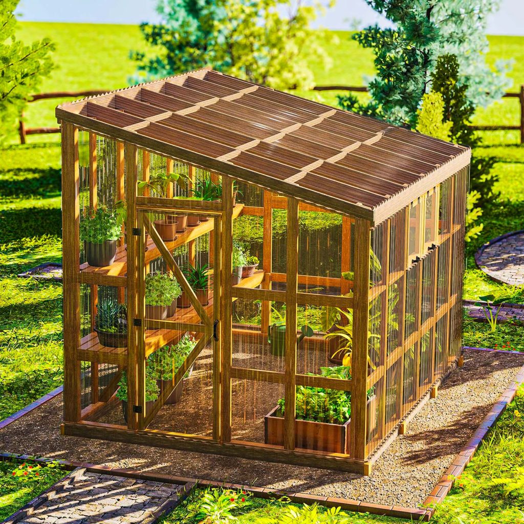 A perfectly square and space-efficient 8×8 greenhouse. This smart design is packed with features, including multiple vents for airflow, a wide door for easy access, and included 2-tier shelving plans for a highly functional build.